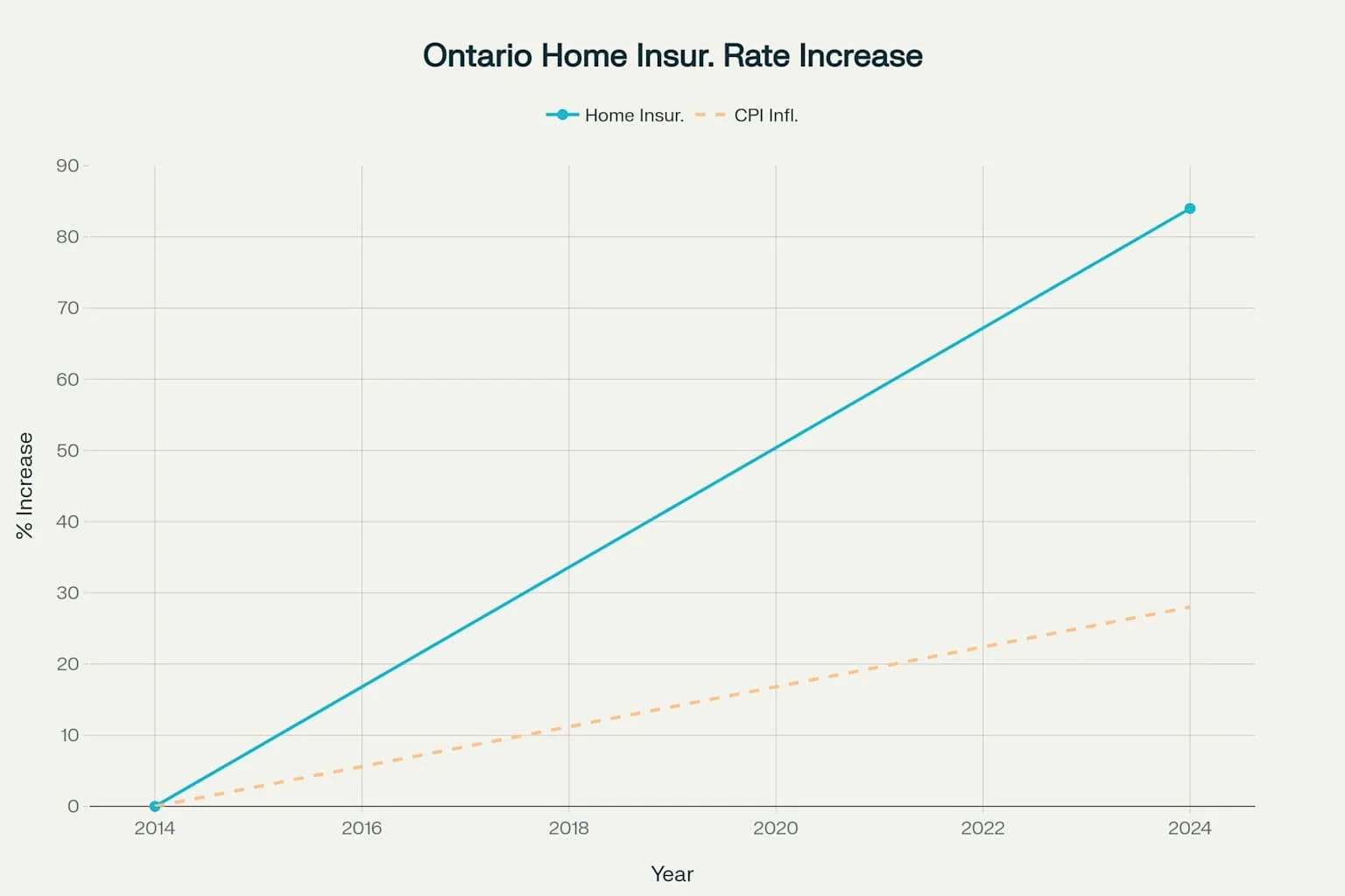 Between 2014 and 2024, Ontario home insurance rates soared by a staggering 84%. For context, the general cost of living (measured by CPI inflation) only rose 28% in the same period. That means your insurance bill likely grew three times faster than your grocery or utility costs.